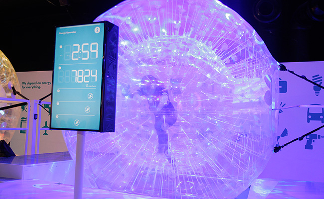 Visitors are then taught what energy is like through various interactive quizzes and activities that let them create energy themselves. These include an energy-producing dance floor, which converts human kinetic energy to electrical energy, and giant zorbs they run inside of (like hamsters) to show how much energy is needed to power their daily lives.