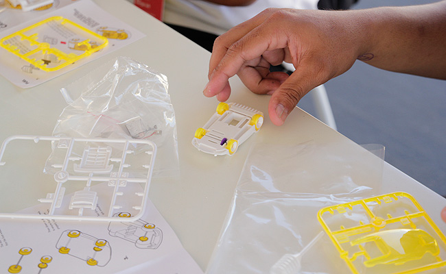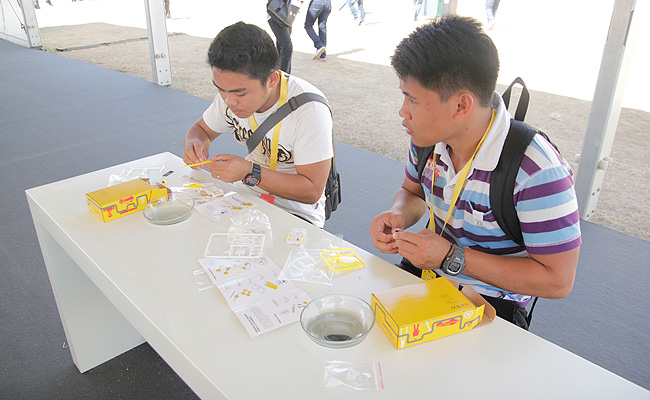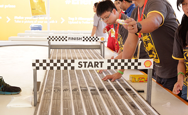 Finally, an expansive area allows visitors to create and customize their own mini eco-marathon car, which will be given to them during registration. Each vehicle is designed to run on salt water on a special racetrack to encourage a fun and friendly competition among participants.
