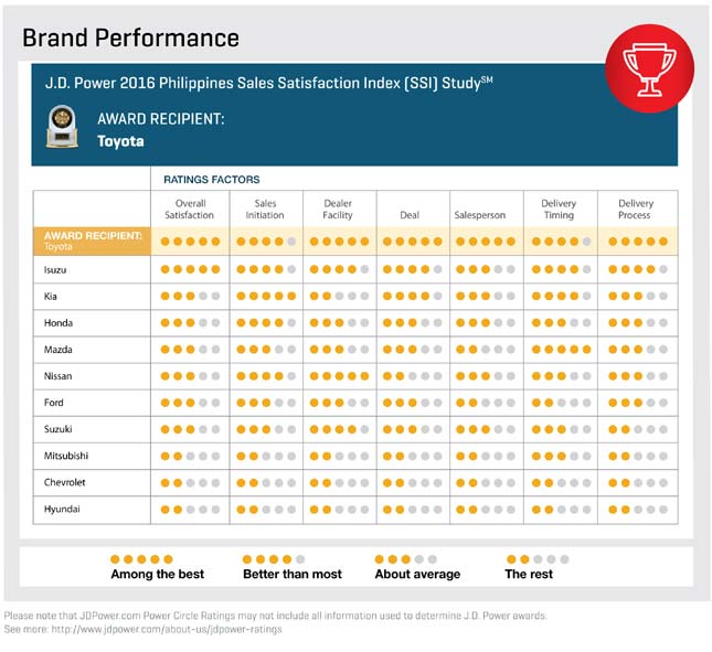 Surprise, surprise. Toyota is once again number one in the latest J.D. Power Sales Satisfaction Index Study (SSI) in the country. The company beat 10 other mass-market car brands to claim the top spot.