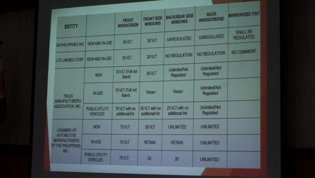 *What about the factory tint that comes equipped with your car? Galvante: "This [regulation] would also cover not only yung mga tint na dinidikit, but rather, even those factory-tinted windshields or something should also comply with whatever is going to be authorized as the grade of tint that should be allowed." He reassured the forum that car manufacturers will be given enough time to adapt their practices.