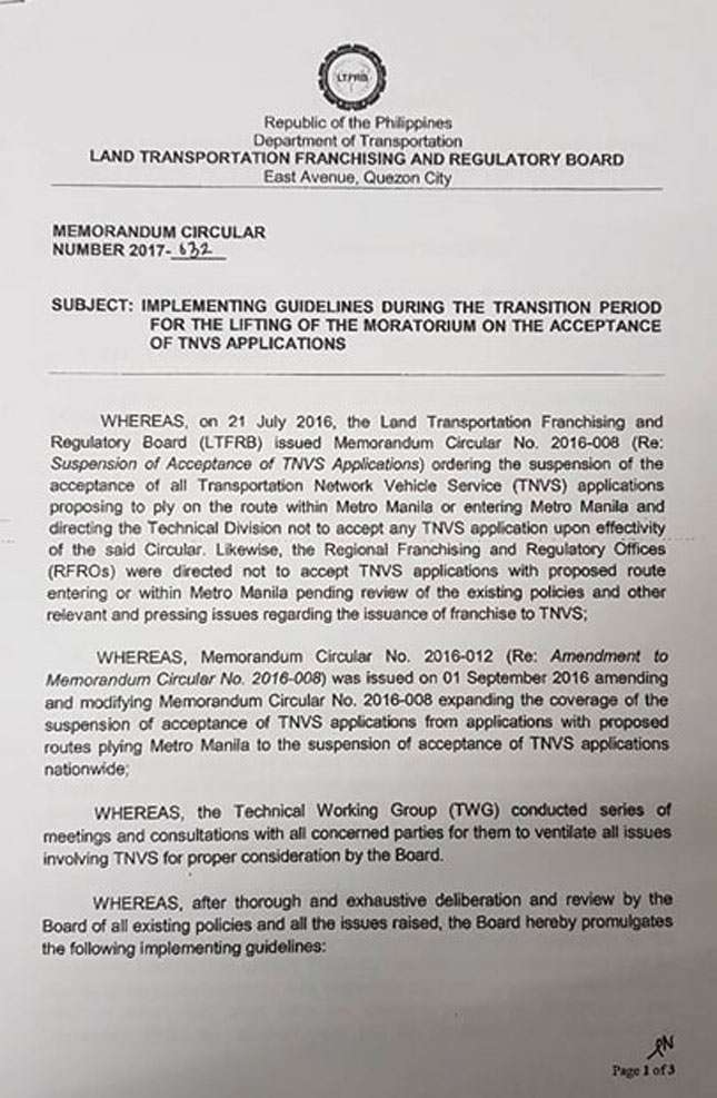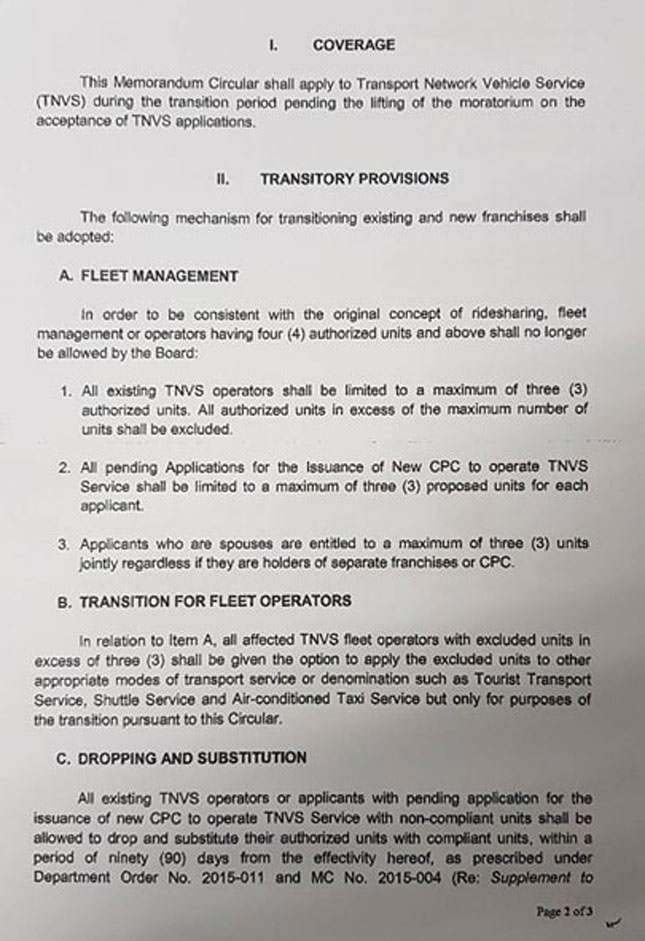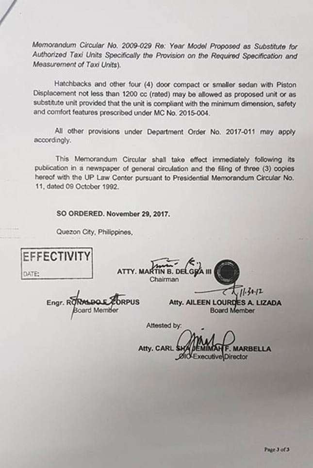 All this falls under memorandum circulars (MC) 2017-032 (seen below) and 2015-004. TNVS vehicles with a certificate of public convenience (CPC) must replace or substitute hatchbacks which do not meet these requirements "within 90 days from December 2 to the effectivity of the MC." This is so operators have time to file their respective petitions for dropping and substitution, Lizada added. "At least may substantial compliance sa deadline tayo."