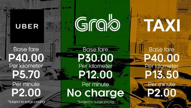 To give you a bit of context on those numbers, let's say you need to take a 5km trip that will take 30 minutes. Sans surge pricing, that would cost P128.50 on Uber and P90 on Grab, respectively. In a taxi, that adds up to P167.50.