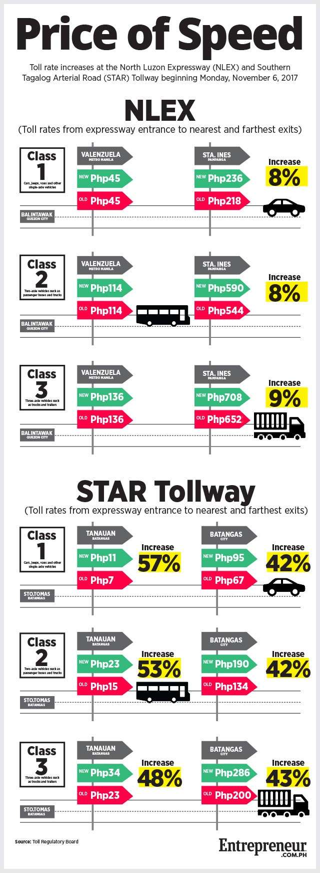 The operators of North Luzon Expressway (NLEX) and Southern Tagalog Arterial Road (STAR) Tollway will start charging higher toll rates starting today, November 6, 2017, after winning a long sought-after approval from the Toll Regulatory Board (TRB), the government agency that regulates expressways.