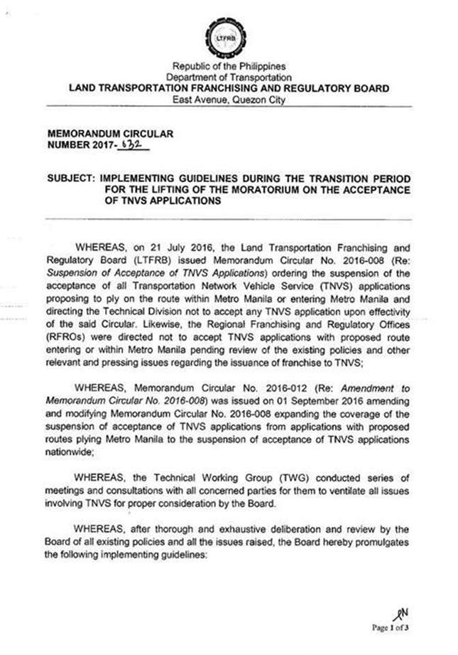 The Philippine Land Transportation Franchising and Regulatory Board (LTFRB) has released implementing guidelines for the lifting of the moratorium on Transport Network Vehicle Service (TNVS) applications.