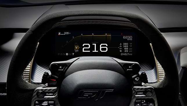 The company points out that utmost driver focus and attention are vital when driving a high-performance vehicle like the GT. With that in mind, the display was built around the data it displays and changes its look depending on which of the car's five driving modes is selected. This allows drivers to make quick decisions behind the wheel in as efficient a manner as possible, Ford says.