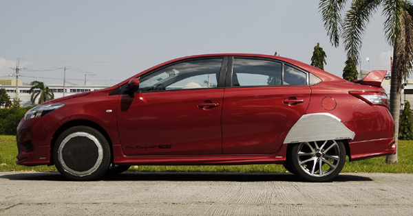 After a few afternoons wasted fabricating parts on our fantabulous Toyota Vios bodykit, it's finally time to go out and see if all that work will pay off.I finally tape the wheel skirts to the car. They're not as