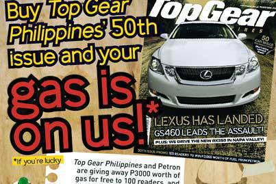 Car enthusiasts still have one week to join Top Gear Philippines' (TGP) Gas-is-on-Us promo. An exclusive gas card awaits 100 lucky readers who will win TGP's special treat of P3,000 worth of fuel from Petron